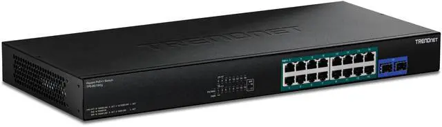 TRENDnets 18-Port Gigabit PoE++ Switch, model TPE-BG182g, provides high-bandwidth performance, ease-of-use, and reliability. This IEEE 802.3 bt compliant switch features a sturdy 1U 19 rack mountable metal housing with mounting brackets included, and also offers gigabit SFP ports for long-distance fiber networking applications.