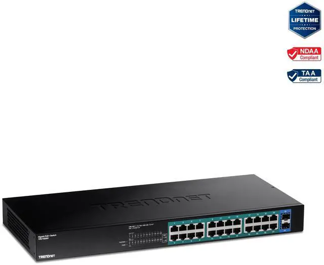 TRENDnet 26-Port Gigabit PoE+ Switch, 24 x 30W PoE+ Ports, 2 Gigabit SFP Slots, 380W PoE Budget, 52Gbps Switching Capacity, 1U 19" Rack Mountable, Lifetime Protection, Black, TPE-TG262
