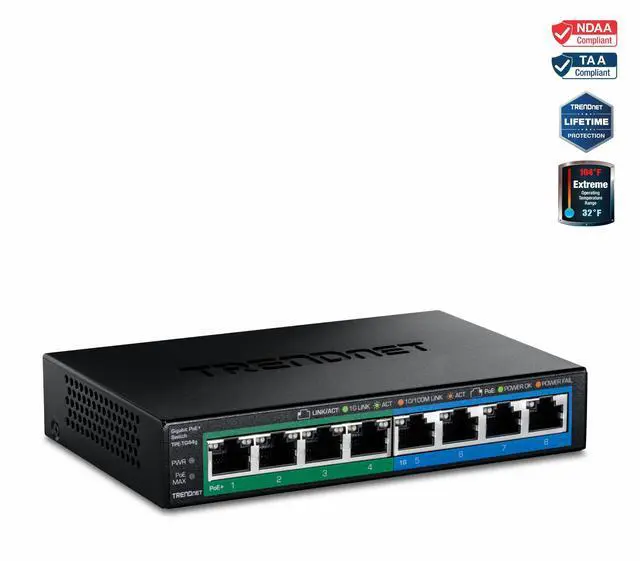 TRENDnets 8-Port Gigabit PoE+ Switch, model TPE-TG44g, reduces equipment and installation costs by delivering data and power