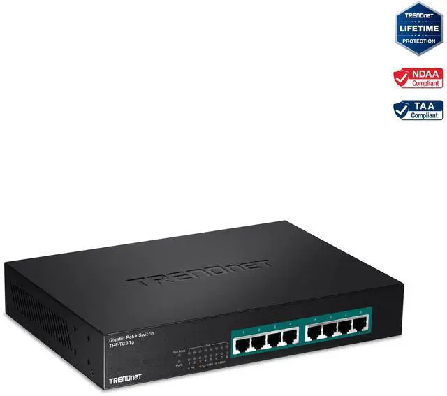 TRENDnets 8-Port Gigabit GREENnet PoE+ Switch, model TPE-TG81g, reduces equipment and installation costs by delivering data and power over existing Ethernet cables. This unmanaged switch offers eight Gigabit PoE+ ports which supply up to 30W of power per port for devices such as high power wireless access points, IP Cameras, and VoIP telephony systems. It supports both PoE ( 802.3 af) and PoE+ ( 802.3 at) devices with a 110W PoE budget. This rack mountable switch features a fanless design that eliminates operating noise and lowers energy consumption.