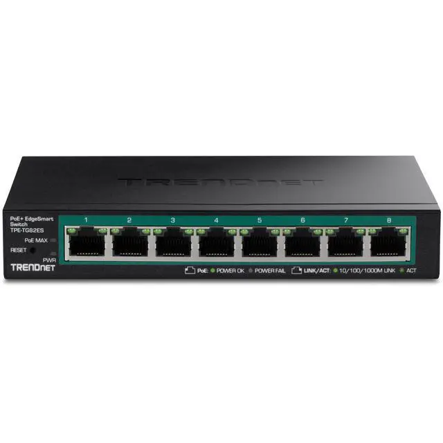 TRENDnets 8-Port Gigabit EdgeSmart PoE+ Switch, model TPE-TG82ES, is a cost-effective desktop PoE managed switch solution