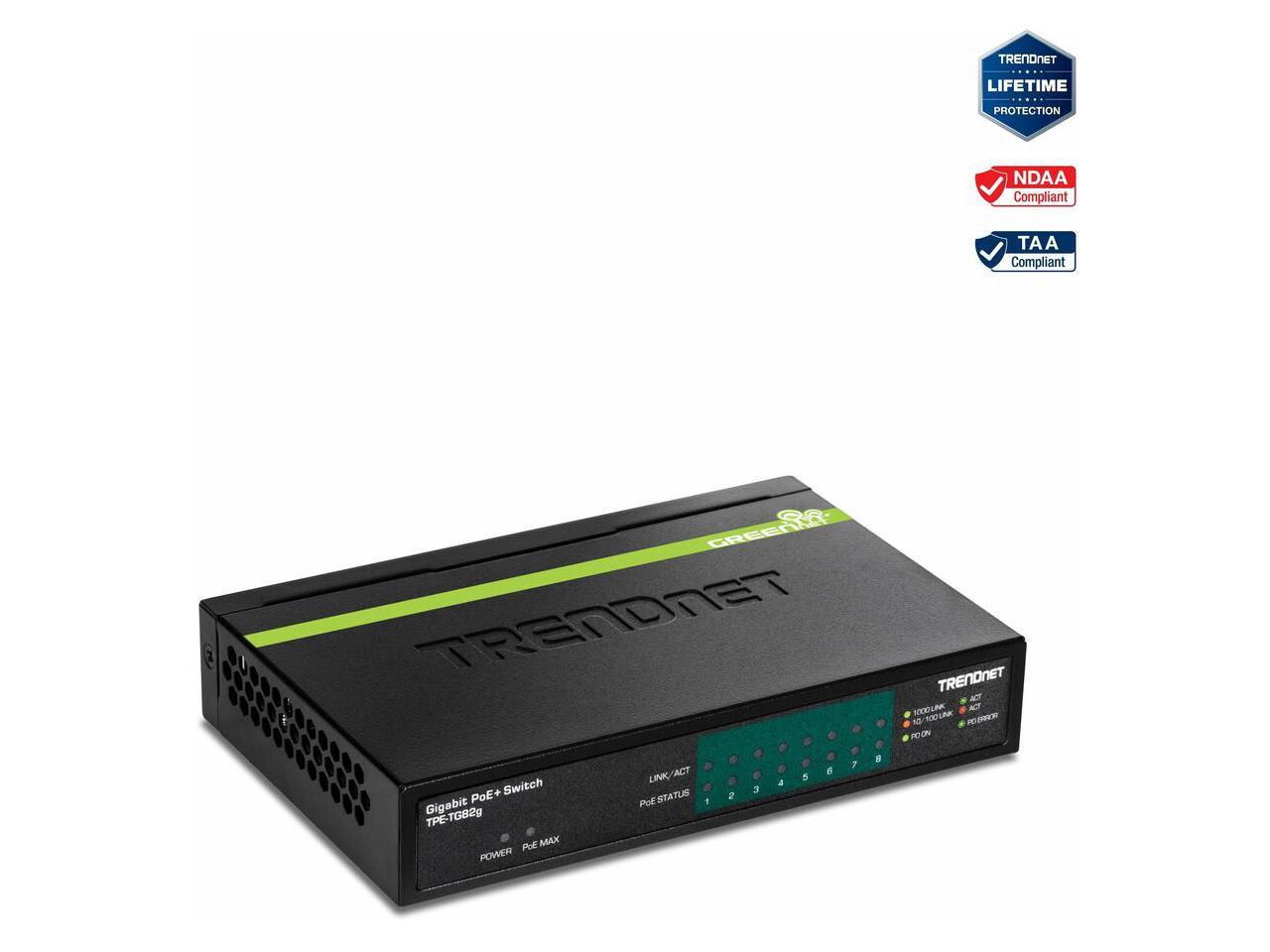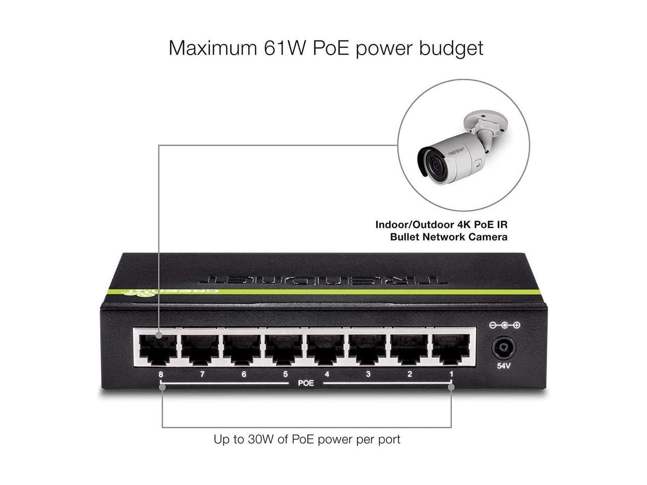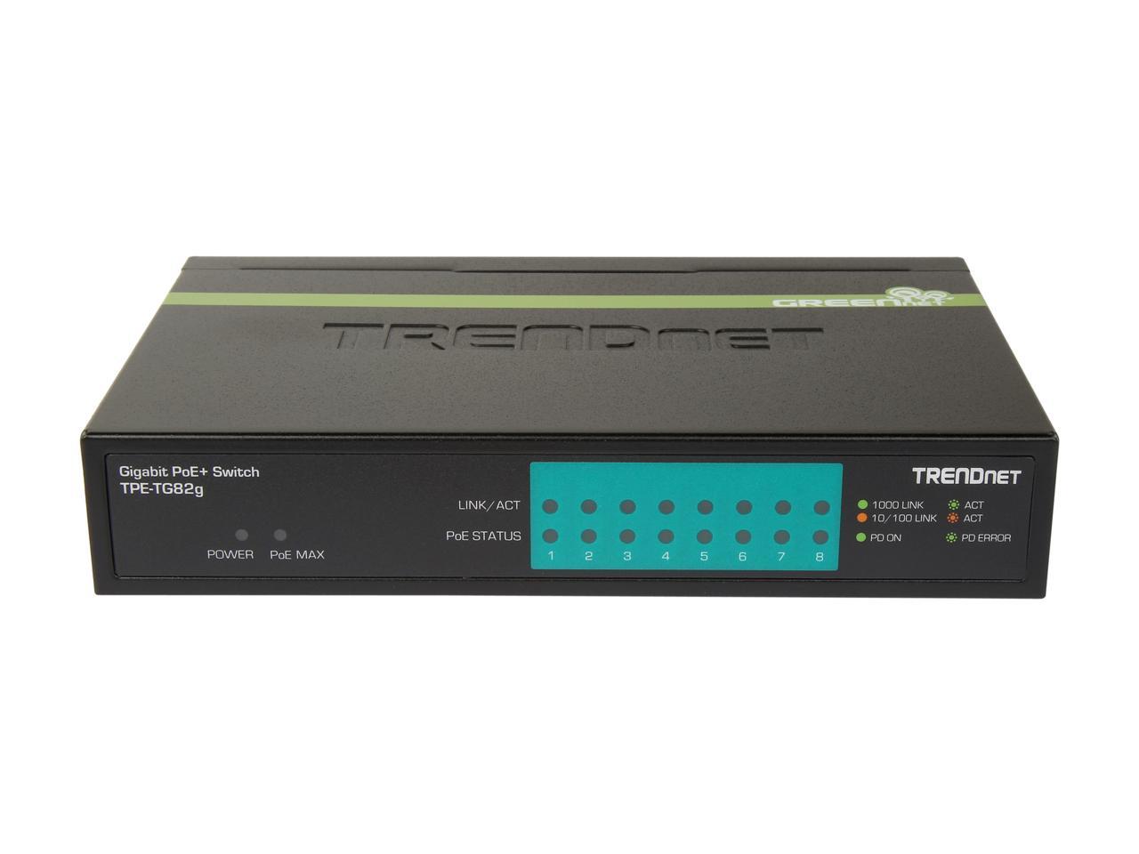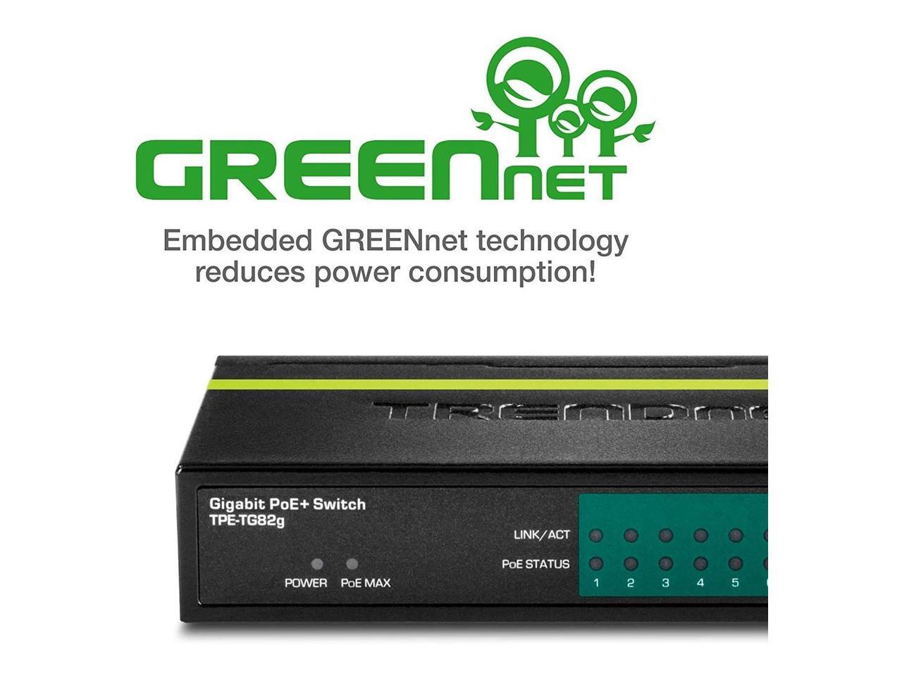 TRENDnet 8-Port GREENnet Gigabit PoE+ Switch, Supports PoE And PoE+ Devices, 61W PoE Budget, 16Gbps Switching Capacity, Data & Power Via Ethernet To PoE Access Points & IP Cameras, Black, TPE-TG82G