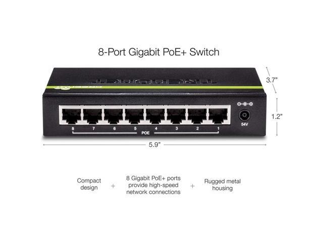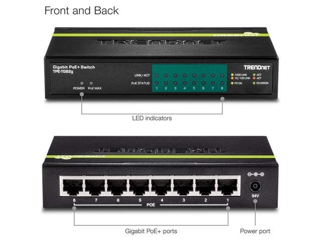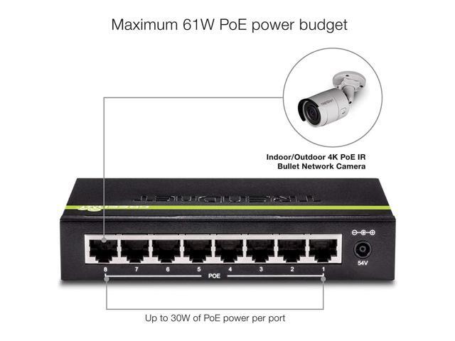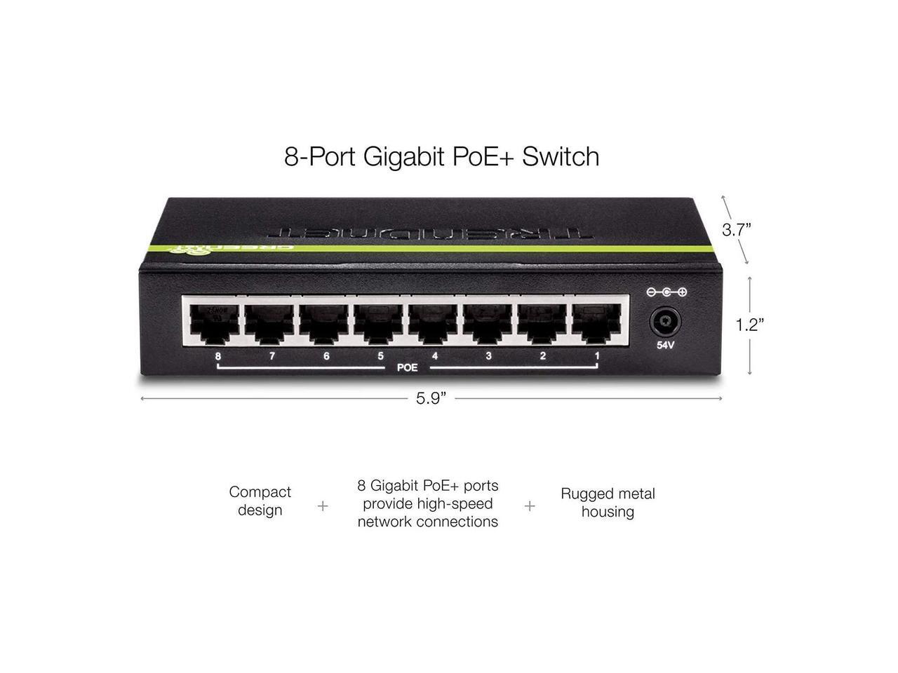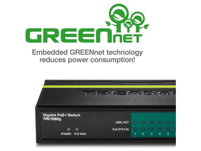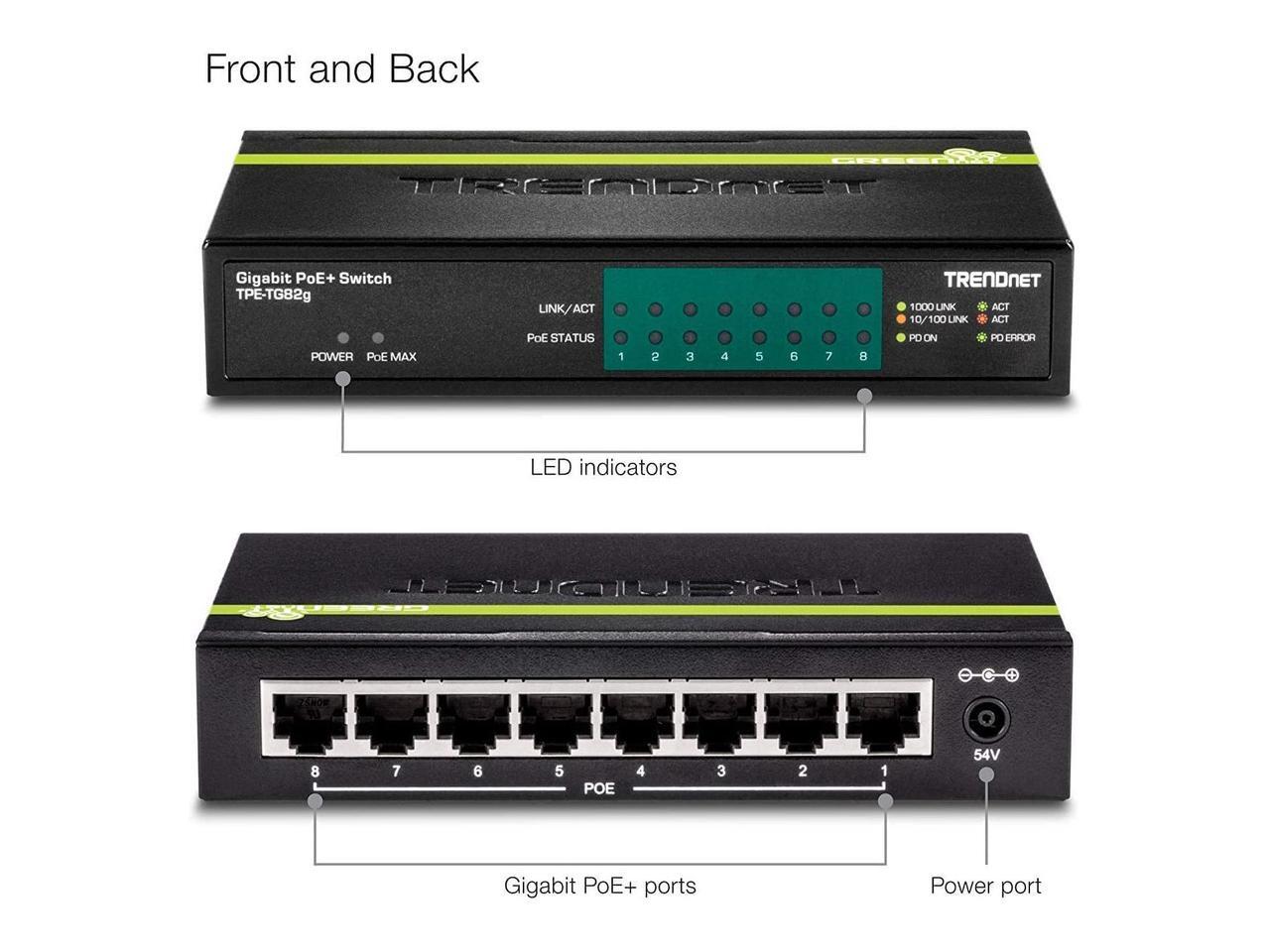 TRENDnet 8-Port GREENnet Gigabit PoE+ Switch, Supports PoE And PoE+ Devices, 61W PoE Budget, 16Gbps Switching Capacity, Data & Power Via Ethernet To PoE Access Points & IP Cameras, Black, TPE-TG82G