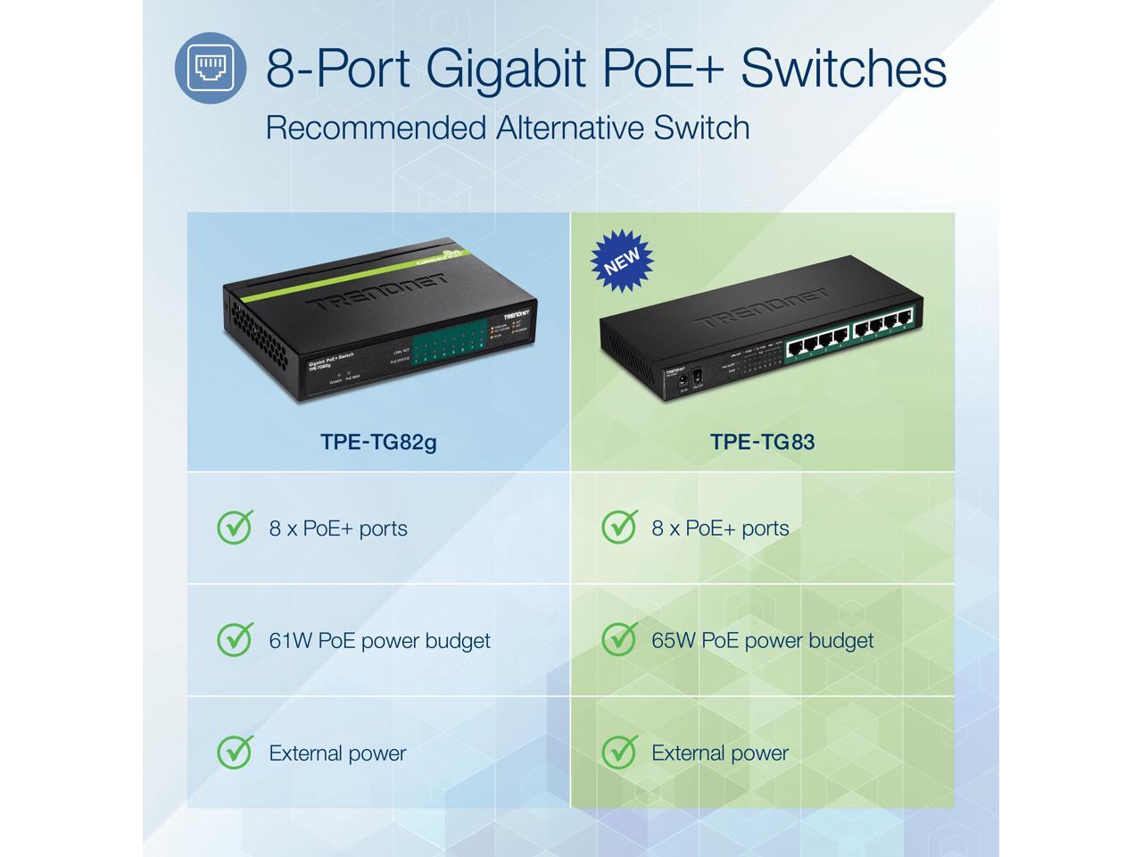 - We stand by the quality of our products. The TPE-TG83 8-Port Gigabit PoE+ Switch is secured with Lifetime Manufacturer Protection from TRENDnet. (U.S. and Canada Only)