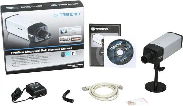 The ProView MegaPixel PoE Internet Camera (model TV-IP522P) transmits real-time video over the Internet at up to 1280 x 960 resolution. Manage up to four video profiles to record megapixel H.264 quality video while at the same time streaming content to a compatible 3GPP mobile phone. No need to install this camera near a power source, power and data are received through a single Ethernet cable using Power over Ethernet (PoE) technology. Manage up to 32 TRENDnet ProView cameras with the included complimentary camera management software. Advanced features include Samba client support, motion detection recording, email alerts, scheduled recording sessions, H.264/MPEG-4/MJPEG image compression, 2-way audio, input/output ports, a removable lens, 16x digital zoom, four video profiles, and a built-in SD card slot to store images directly to a memory card. The camera's extruded aluminum housing has top and bottom mounting points and it comes with a wall/ceiling mounting kit.