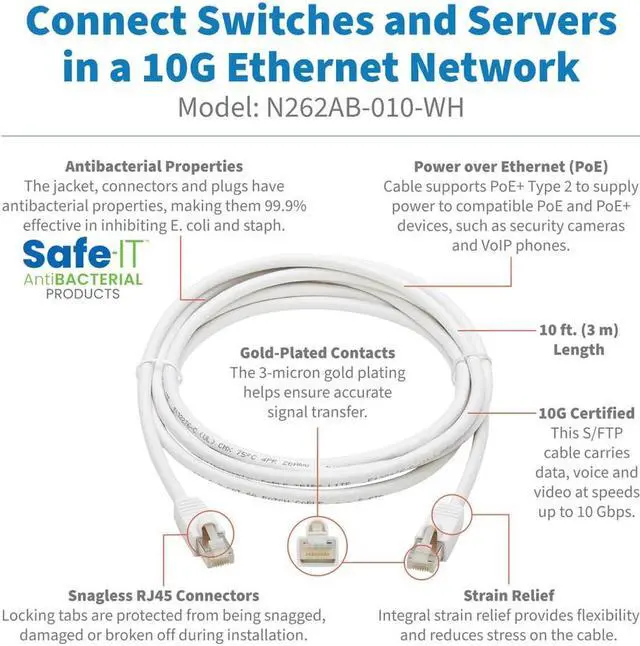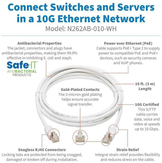 The connectors and PVC jacket are constructed using an antibacterial material that is 99.9% effective in inhibiting Escherichia coli (E. coli) and Staphylococcus aureus (staph). This added protection makes this cable an ideal solution for medical facilities, schools, businesses, restaurants/kitchens and anywhere else that needs extra protection against bacteria.