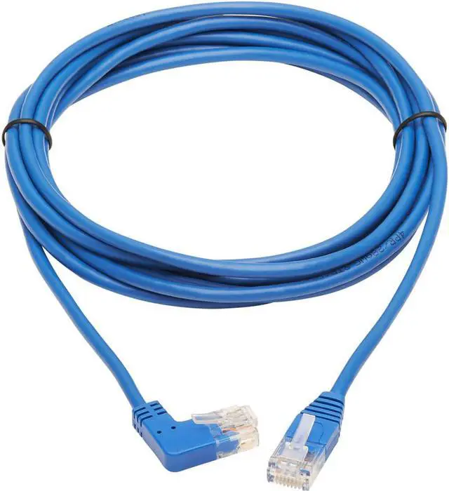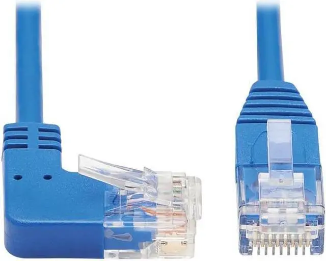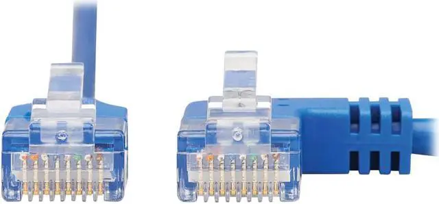 | Features | Cat6 Ethernet patch cable delivers fast transmission speeds up to 1 Gbps in your LAN Right-angle RJ45 connector is easy to plug into switch or panel pressed against a wall Over 38% slimmer than standard Cat6 cables to increase airflow in full racks Easy to route around corners and through crowded cable management panels Cable is blue for fast, easy identification in a crowded rack or workstation |