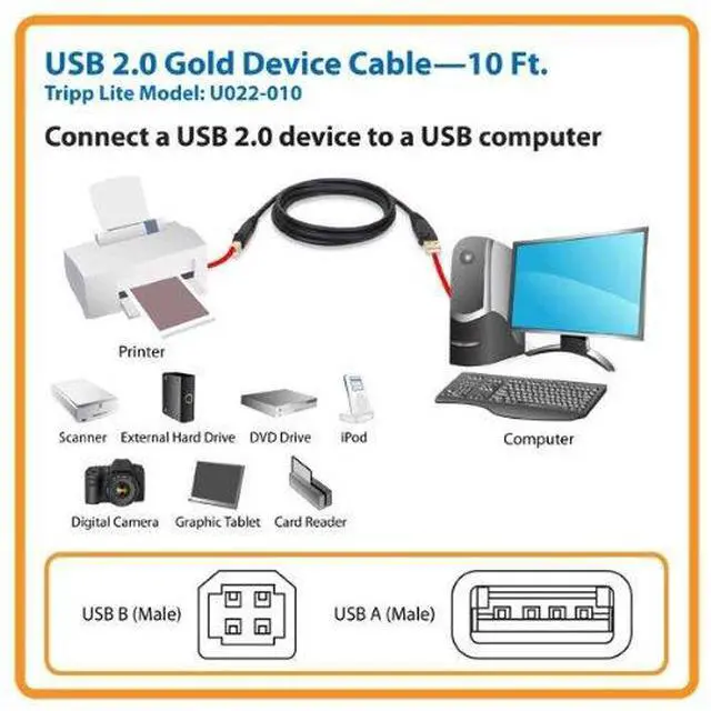 Size: 10 feet U022-010 10-ft. Usb2.0 A/b Gold Device Cable A Male To B Male