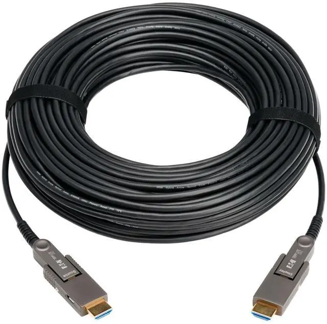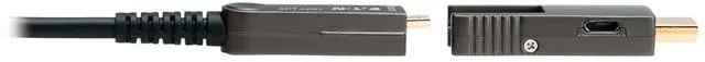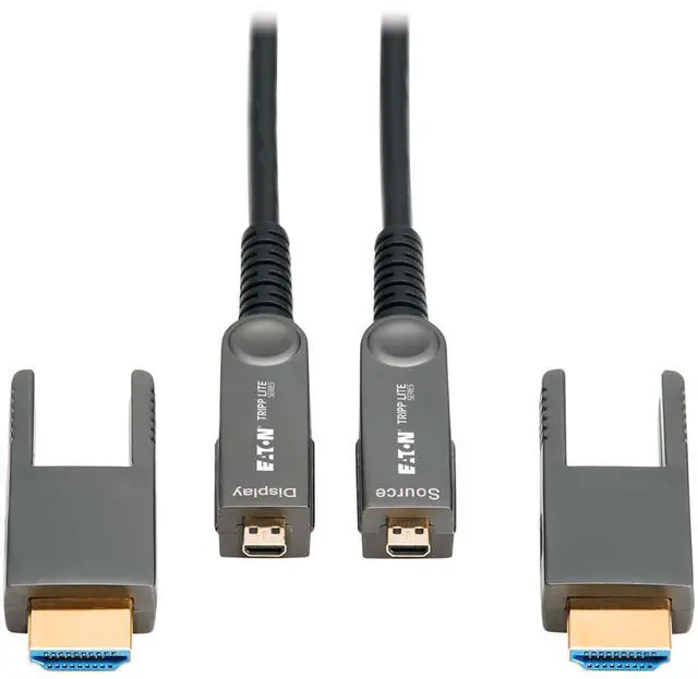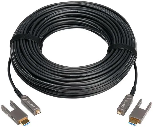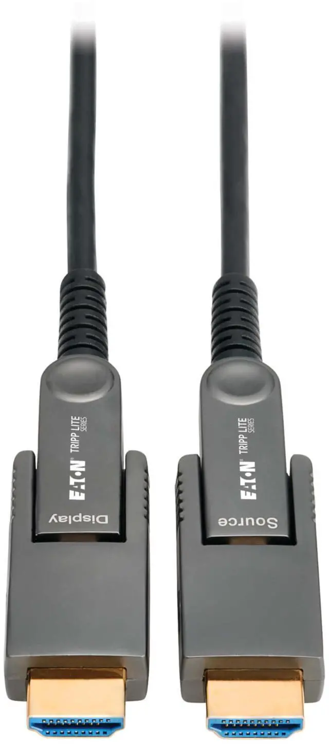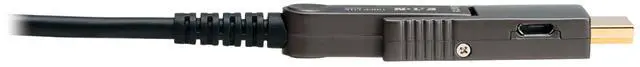 Because the fiber cable is slimmer and more flexible than standard copper HDMI cables, the P568FMM-30M-8K6 is easier to install around corners and in hard-to-reach spaces behind equipment. Detachable HDMI (Type A) to Micro-HDMI (Type D) adapters on each end help you pull the cable through one-inch conduit (drill smaller holes if routing cable through walls or surfaces). Note: The cable must be installed in the correct direction to function properly, so please check the Source and Display labels on the connectors before installation.