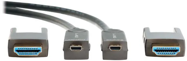 This HDMI cable (M/M) securely connects laptops, tablets, PCs, Blu-ray players, game consoles or satellite/cable TV boxes to HDTVs, HD monitors, projectors or home theater receivers. Because the cable uses optical fiber, it can transmit HDMI signals longer distances with no latency or loss.