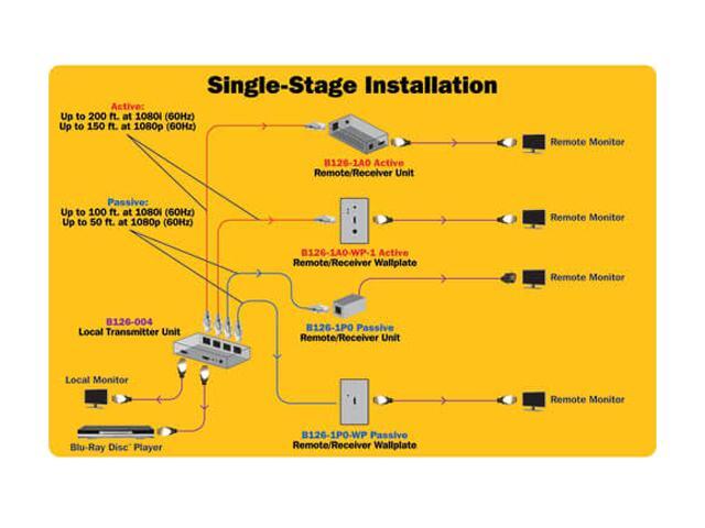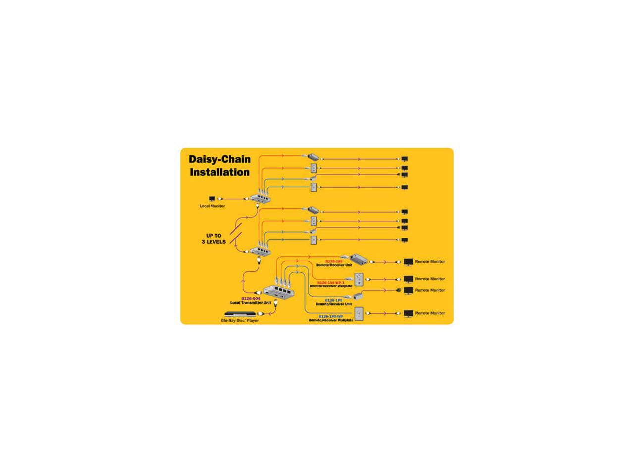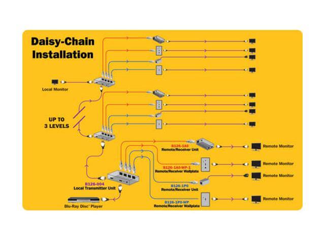 - Works with Tripp Lite’s B126-Series receivers to split a single HDMI signal into five separate signals (one local and four remote), each on one cable, to five projectors, monitors or televisions in a chain.