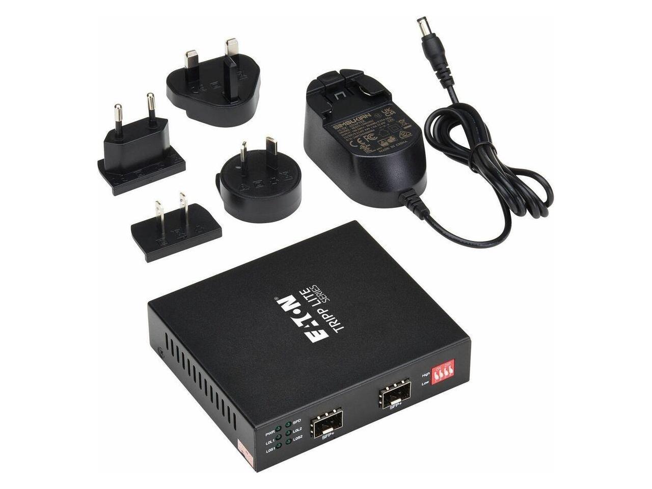 - N786-MDC-SFPSFP 10 Gb SFP+ to 10 Gb SFP+ Mode Converter, External power supply (Input: 100240V, 50/60 Hz, 0.35A; Output: 12V 1A) with 4.5 ft. (1.4 m) cord, (4) International plug adapters (North America, Europe, U.K., Australia), Quick Start Guide