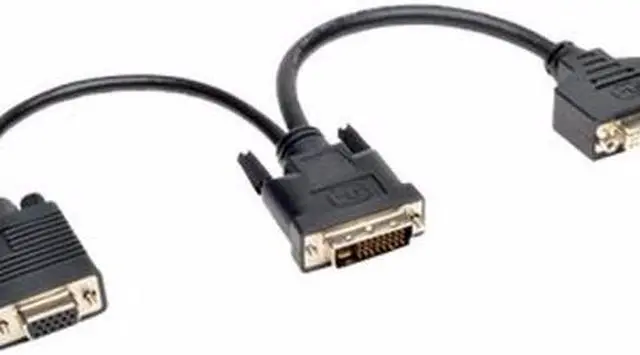 Tripp Lite 6in DVI Digital Y Splitter Cable DVI-I M to DVI-D F and HD15 F 6" - DVI adapter - dual link - DVI-I (M) to HD-15, DVI-D - 5.9 in - blackTripp Lite's 6-in. DVI Y splitter cable provides an inexpensive way to split the video signal from your PC's DVI-I port to DVI-D and VGA monitors. Supports computer video resolutions up to 1920 x 1200, and HD resolutions up to 1080p (60 Hz).