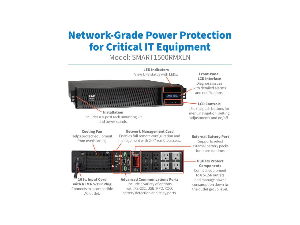 Tripp Lite series SmartPro 1440VA 1440W 120V Line-Interactive Sine Wave UPS - 8 Outlets, Extended Run, Network Card Included, LCD, USB, DB9, 2U Rack/Tower (SMART1500RMXLN)