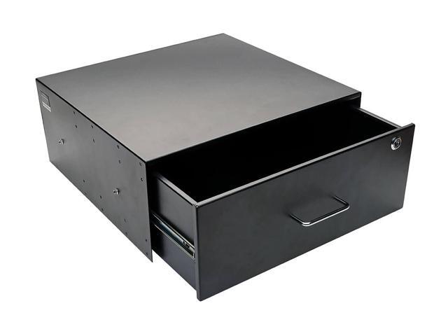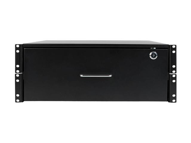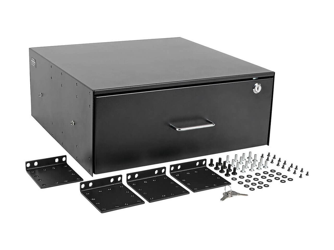 4U drawer mounts in EIA-standard 19 in. 2-post rack to store tools, notes, cables, computer discs and other essential rack equipment accessories up to 50 lb