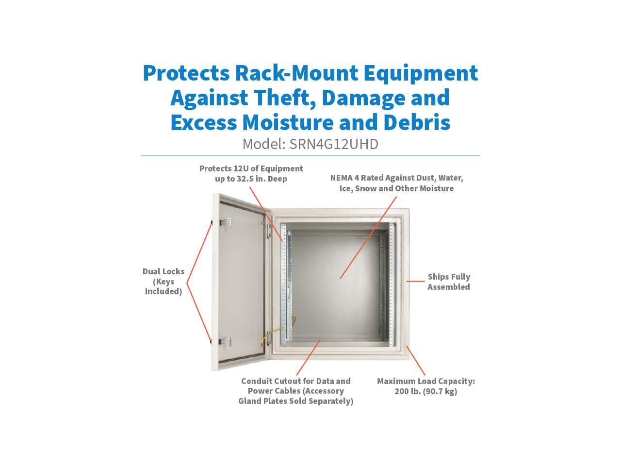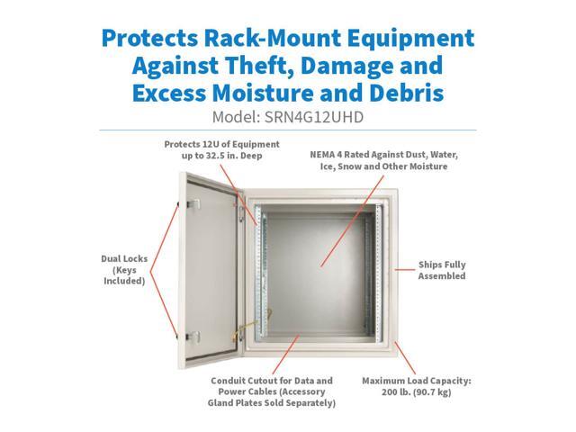 Heavy-duty sealed metal housing protects 12U of rack equipment up to 32.5 in. deep