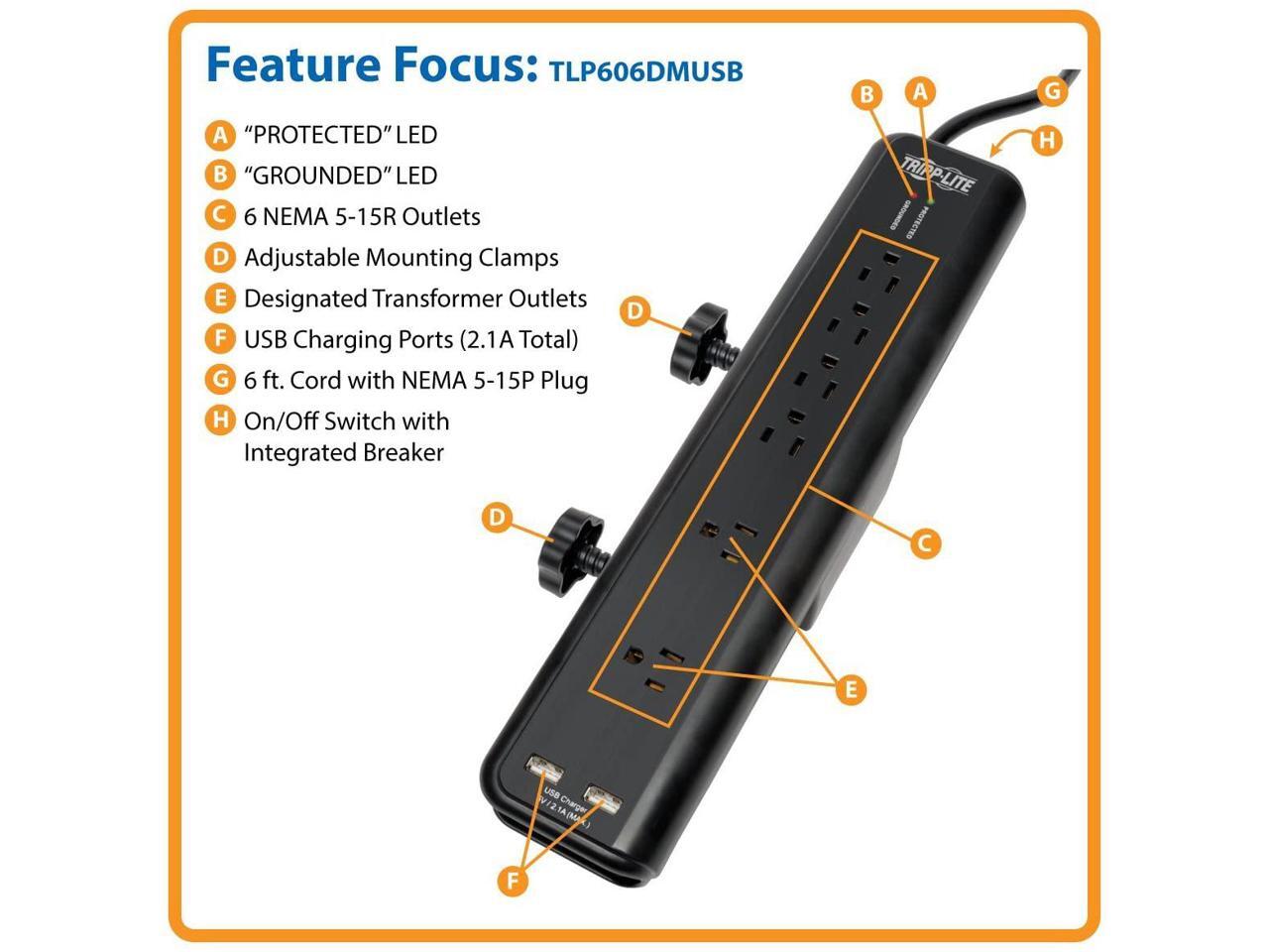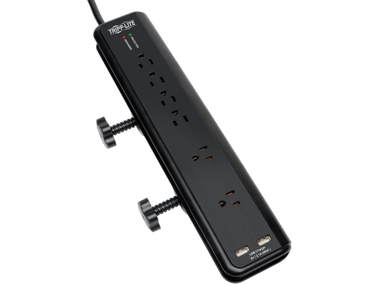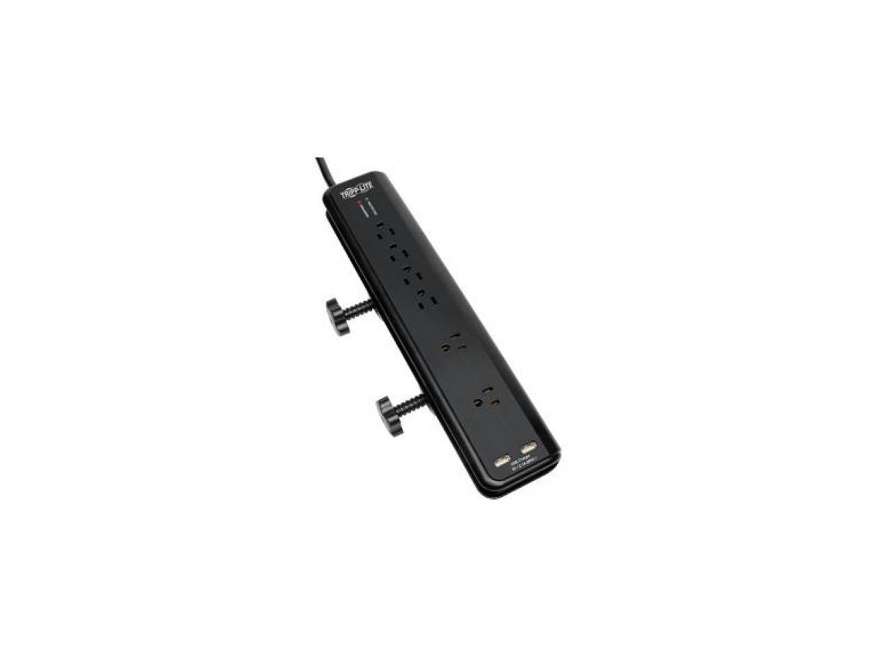 Tripp Lite TLP606DMUSB Protect It! 6- Outlet Clamp-Mount Surge Protector, 6-ft. Cord, 2100 Joules, 2 USB Charging Ports (2.1A total)