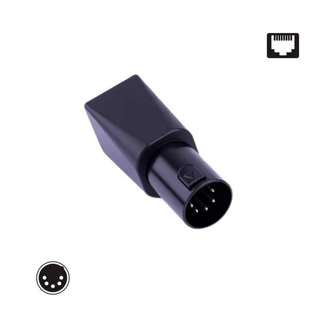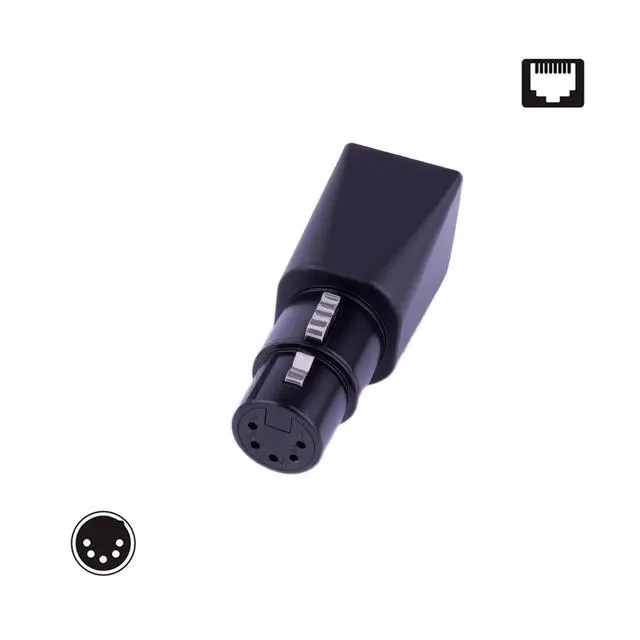 Male-to-Female, Black, Converts DMX512 XLR connector to RJ45 connector, Enables use of CAT-5 ethernet cable as DMX512 cable, Compatible with 3-pin and 5-pin XLR configurations