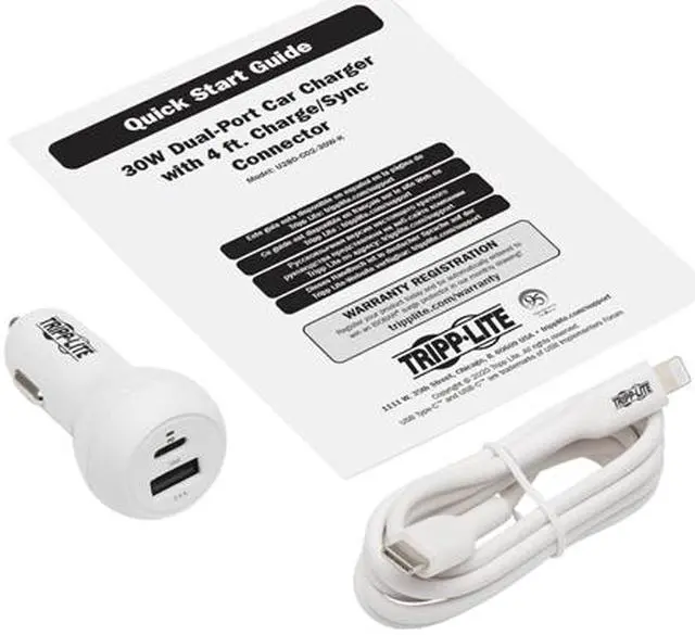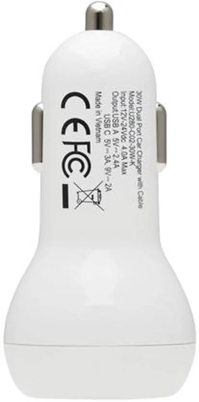 | Features | USB Car Charger Safely Charges 2 Mobile Devices in Your Vehicle Simultaneously This dual-port USB car charger lets you quickly and safely charge two USB mobile devices at the same time. You and a passenger can connect your smartphones, tablets, notebooks or power banks, to name just a few compatible devices, to ensure satisfactory battery charge when you reach your destination. A Combined 30W of Charging Power Feeds Your Power-Hungry Devices When used together, the USB-C and USB-A ports support up to 30W of charging power. The USB-C PD 3.0 port can support up to 18W (5V 3A or 9V 2A) to keep mobile devices at capacity. The USB-A port can support up to 12W (5V 2.4A) to reliably charge smartphones and tablets. Plugs into the 12V DC Power Outlet in Your Vehicle The compact charger connects to any standard 12V DC vehicle power outlet, such as the one on your dashboard. Just plug it in and connect your devices' USB cables (or the included USB-C to Lightning cable) for fast, convenient mobile charging. An easy-to-see green LED indicates the charger is receiving power. The U280-C02-30W-K is compatible with Apple (including iPhone), Android (including Samsung), Windows and Amazon devices with USB-A, USB-C or Thunderbolt 3 charging ports. |
