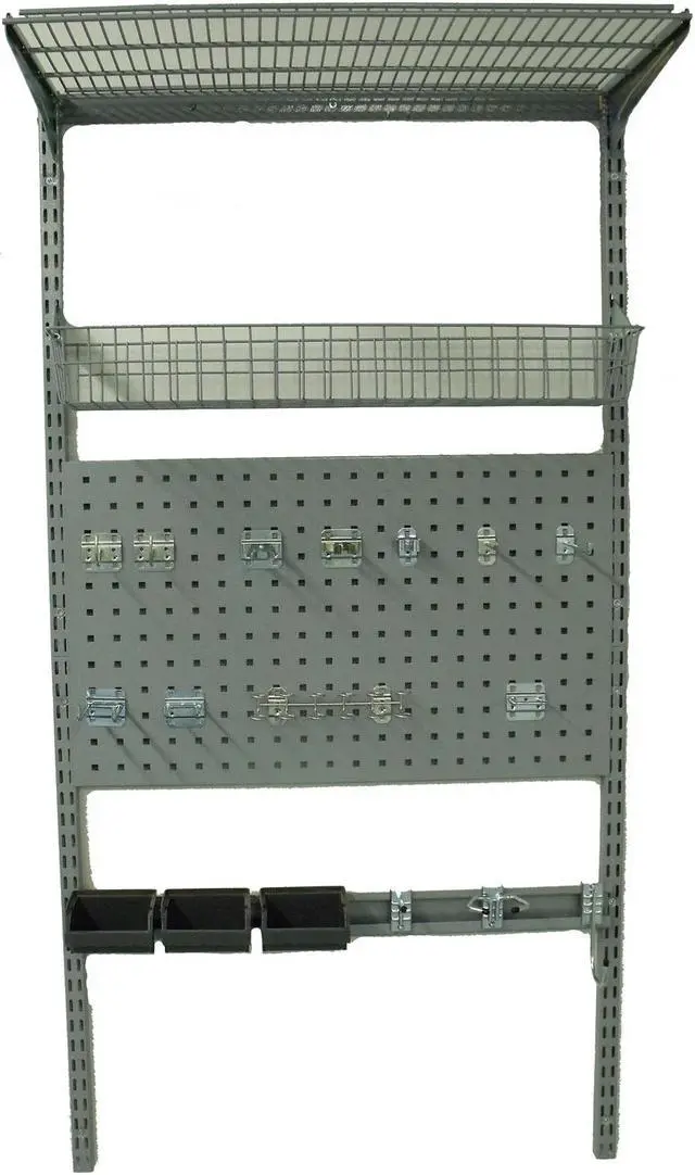 Modular Wall Storage, Steel, Epoxy Coated, Gray, Overall Depth 16 in, Overall Height 63 in, Overall Width 33 in, Mounting Type Wall Mount, Product Type Shelving Unit, Includes (2) 3 Part Vertical Hang Rails, (3) Hanging Bins, (3) Heavy-Duty Hooks, 31 in Combination Rail, 31 in Wide x 15 in Deep Wire Shelf, 31 in Wire Basket and All Required Hardware, 33 in Top Track, Steel Pegboard with (11) Commercial Hook Assortment. This item has been restricted from sale in the following state (s): []