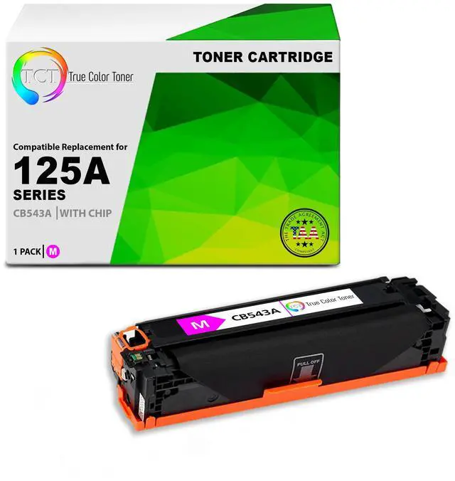 TCT offers quality HP 125A CB543A compatible replacement cartridges that fit effortlessly into your printer. You will find crisp, clear prints with consistently dark tones and sharp images in every single print job. Get professional quality prints every time and save a bundle with True Color Toners high quality printing supplies!