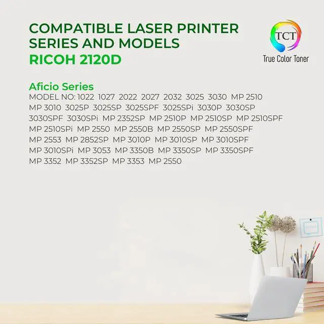 TCT offers quality Ricoh Type 2120D 888169 compatible replacement cartridges that fit effortlessly into your printer. You will find crisp, clear prints with consistently dark tones and sharp images in every single print job. Get professional quality prints every time and save a bundle with True Color Toners high quality printing supplies!