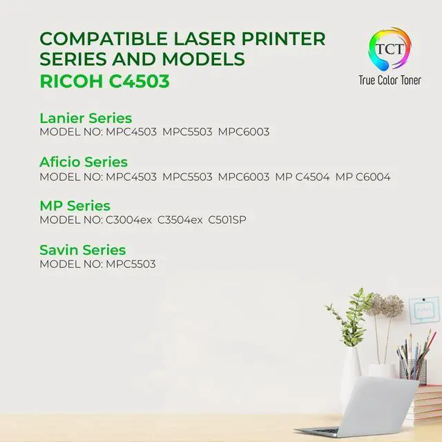 TCT offers quality Ricoh C4503 841849 compatible replacement cartridges that fit effortlessly into your printer. You will find crisp, clear prints with consistently dark tones and sharp images in every single print job. Get professional quality prints every time and save a bundle with True Color Toners high quality printing supplies!