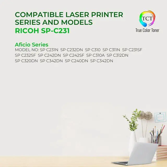 TCT offers quality Ricoh SP-C231 406346 High Yield compatible replacement cartridges that fit effortlessly into your printer. You will find crisp, clear prints with consistently dark tones and sharp images in every single print job. Get professional quality prints every time and save a bundle with True Color Toners high quality printing supplies!