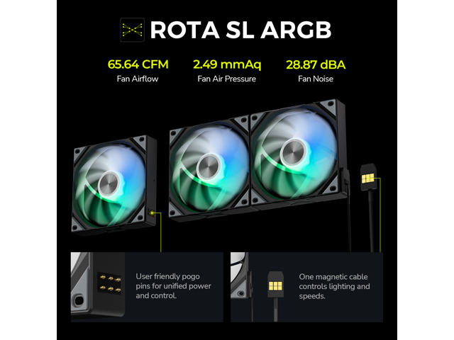 - Three 120mm pre-installed magnetic cable ARGB FDB fans with 2.49mmAq air pressure under 27.86dB(A) even in full load