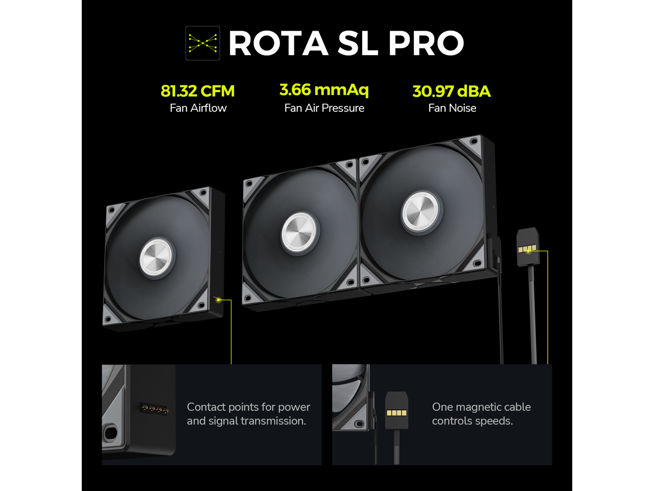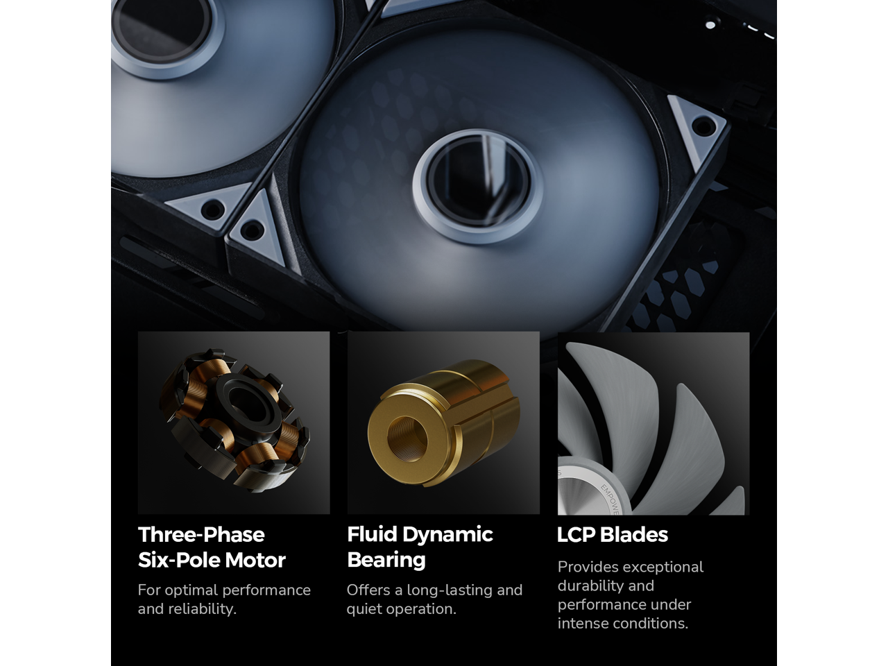 - Three 120mm pre-installed magnetic cable performance FDB fans with 3.66mmAq air pressure and 81.32CFM airflow