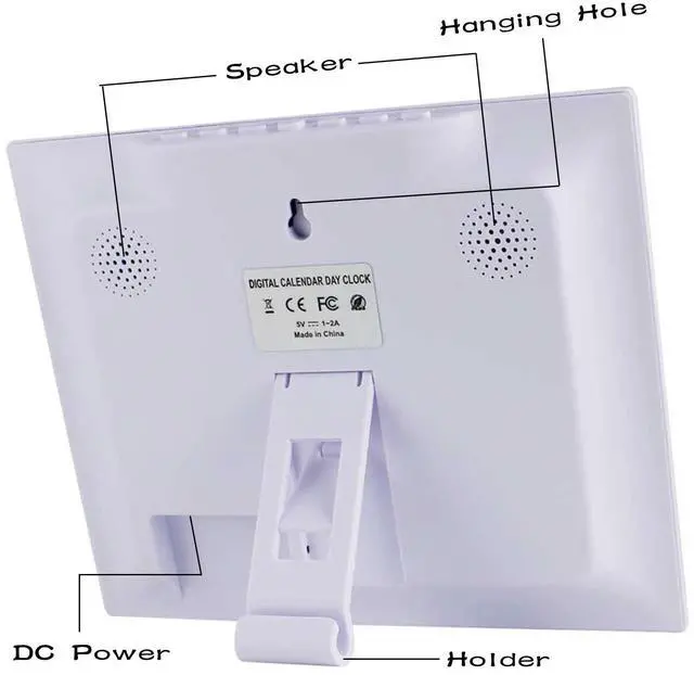 The digital calendar day clock is not only set on the desk, but also hung on the wall. The leg of the clock can be hidden when you hang the clock on the wall.