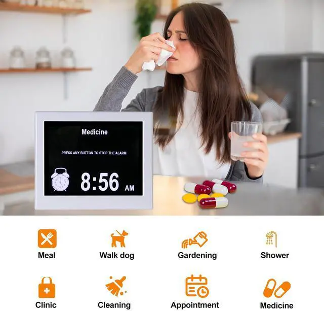 Dementia clock with 12 Alarms Modes. Every alarm has 8 tag can choose: Meal, Medicine, Clinic, Shower, Gardening, Cleaning, Appointment and Walk dog.