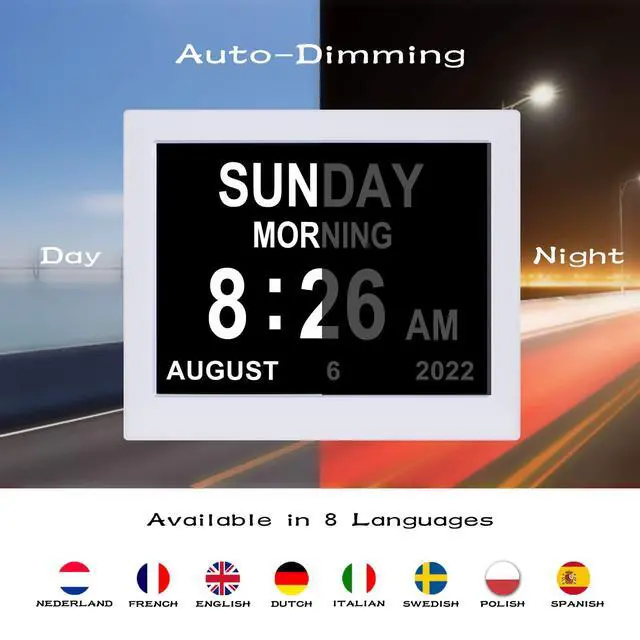 Alzheimer clock with 8 Languages: English, French, Italian, Dutch, Spanish, Polish, Nederland and Swedish.