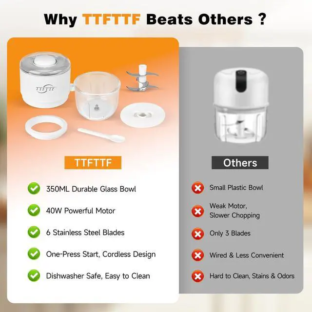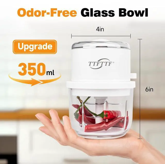 350ML Glass Bowl Mini Food ProcessorUnlike plastic containers, the upgraded 350ML thick glass bowl is sturdy, odor-resistant, and wont absorb flavors. This compact mini food processor is perfect for preparing seasonings, sauces, baby food, or fresh dips without worrying about lingering smells