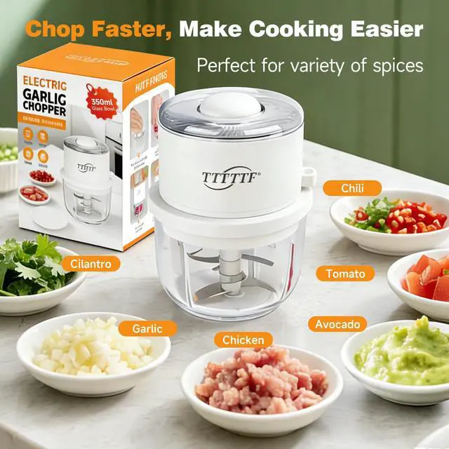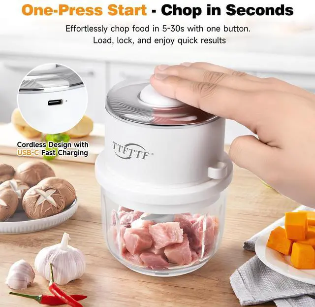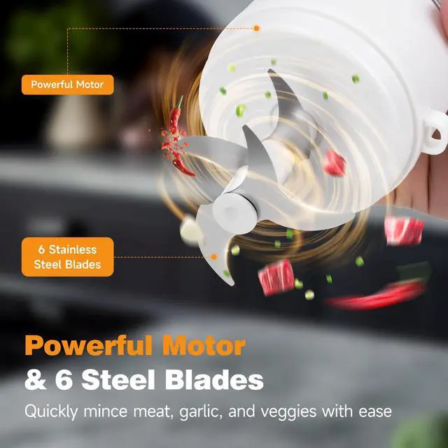 One-Touch & Powerful Garlic MincerEquipped with a 40W powerful motor and 6 sharp stainless steel blades, this garlic mincer and vegetable chopper handles ingredients in just 530 seconds. One press is all it takes to get evenly minced garlic, onion, chili, ginger, nuts, or even small portions of meat