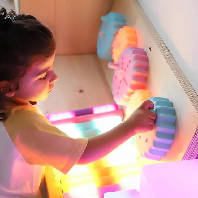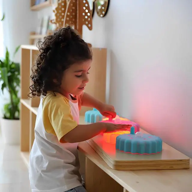 Perfect for classrooms, playrooms, sensory spaces, and early years learning environments, this high-quality wooden board features colorful cogs that light up and change as children twist and turn them, encouraging discovery and cause-and-effect learning in a fun, hands-on way.
