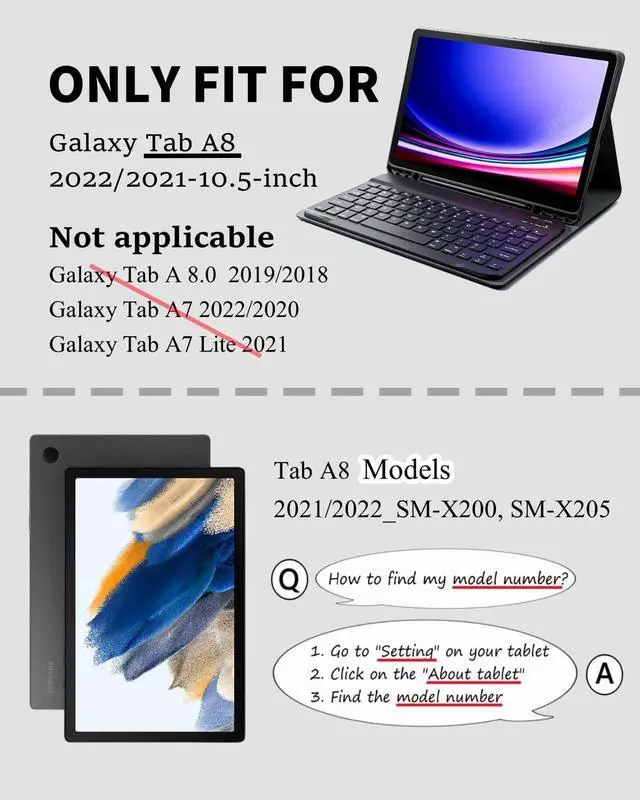 · Model CompatibilityDesigned Only for Samsung Galaxy Tab A8 10.5 inch 2022&2021 (Model: SM-X200, SM-X205). Not compatible with other models. You can check the model number before purchasing to make sure you get the correct size tablet keyboard case.