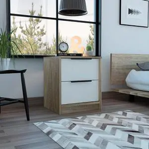Modern Nightstand 19" H, Two Drawers, White / Light Oak