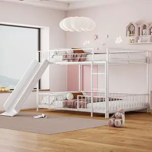 Full over Full Size Metal Bunk Bed with Slide and Guardrails, White