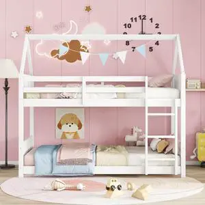Twin Over Twin House Floor Bunk Bed with Headboards, Footboards and Guardrails, Ladder, Rubber Wood Bunk Bed with Safety Guardrails,White Oak