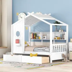 Twin Size Floor Wooden Bed with House Roof Frame, Fence Guardrails,(Twin,Natural)