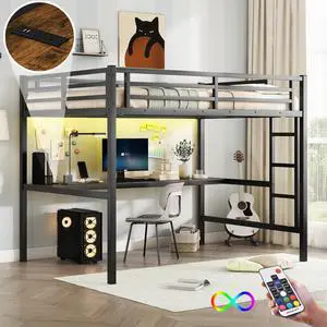 Metal Full Size Loft Bed with Power Outlet and LED Lighted, Space-Saving, Noise Reduced, Black