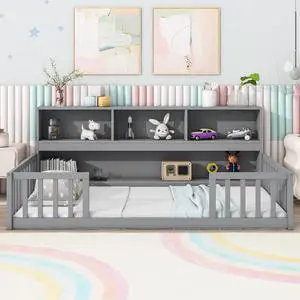 Double Twin Floor Bed with Fence, Guardrails, without door, Grey