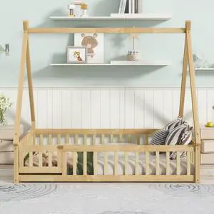 Twin Size Floor Bed with Built-in Book Rack and Door,Natural(Old Sku:W504P143314)