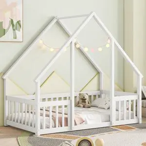 Double Twin Floor Bed with Fence, Guardrails, without door, White