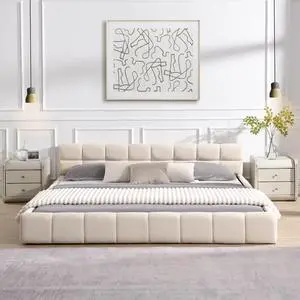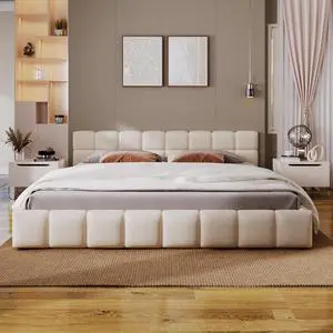 King Size Luxury Upholstered Platform Bed with Oversized Padded Backrest and Solid Wood Frame,suitable for Multiple heights of mattresses,Beige(Old Sku:W1885S00015)