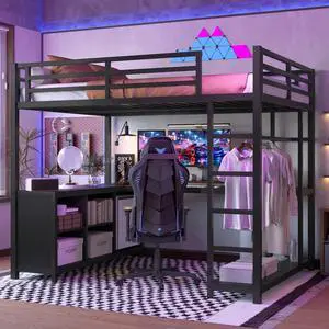 Metal Loft Bed with Wardrobe and L-shaped Desk, Full Size Loft Bed with Storage Cubes and Shelves, Loft Bed for Kids Teens Adults, Black
