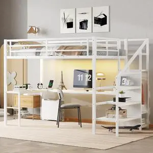Twin XL Size Loft Bed with L-shaped Desk and USB, Metal Loft Bed with Wardrobe and Adjustable Shelf, High Loft Bed with LED for Kids Teens Adults, White