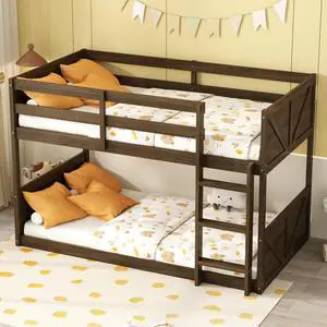 Twin Size Floor Bed with Fence and Door,Rubber Wood Floor Bed with Safety Guardrails,Espresso