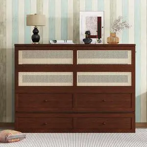 Queen Size Murphy Bed, Pine Wood Cabinet Bed with Rattan Decoration and Storage Drawer,Walnut